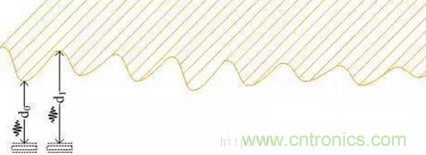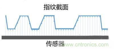 其原理是將電容感整合于一塊芯片中,當(dāng)指紋按壓芯片表面時(shí),內(nèi)部電容感測器會根據(jù)指紋波峰與波谷而產(chǎn)生的電荷差,從而形成指紋影像。如下簡圖,可以把上面的凹凸認(rèn)為是指紋的谷和脊,那么同傳感器就會形成不同的電容差,這樣傳感器就可以根據(jù)這些不同的電容差畫出指紋的紋理。