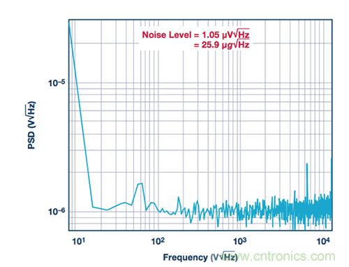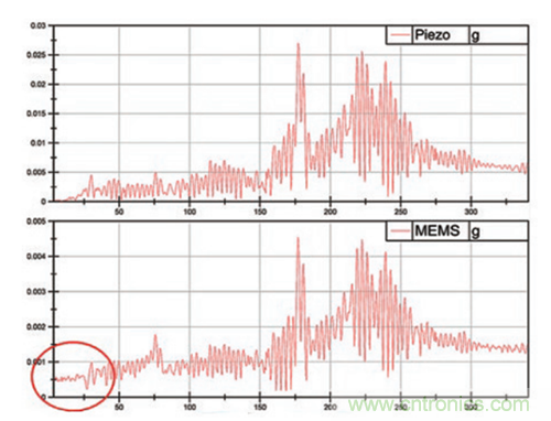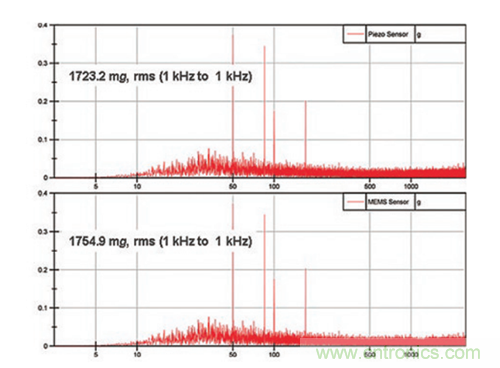 圖2顯示了21 kHz諧振頻率的MEMS加速度計和25 kHz諧振頻率的PZT傳感器的頻譜測量結果。MEMS加速度計在1 Hz至1 kHz頻段中的均方根(rms)輸出要比PZT加速度計高出大約30 mg或1.7%。