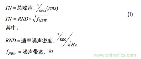傳感器固有噪聲代表的是陀螺儀在靜態慣性和環境條件下運行時其輸出中的隨機振動。MEMS IMU數據手冊通常會提供速率噪聲密度(RND)參數來描述陀螺儀相對于頻率的固有噪聲。此參數通常使用單位°/s/√Hz,是預測特定濾波器配置固有噪聲的關鍵。公式1給出了一種簡單方法來估算與特定頻率響應(噪聲帶寬)和RND相關的噪聲。
