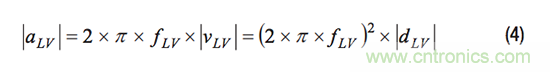 由于陀螺儀用于測量旋轉角速率,因此其對線性運動的響應會引入測量誤差。MEMS IMU數據手冊通常通過“線性加速度對偏置的影響”或“線性加速度”等參數來描述對線性運動的這一響應,這些參數通常使用單位°/s/g。線性振動是一種重復的慣性運動,其幅度大小可通過位移(m)、線性速度(m/s)或線性加速度(m/s2或g)表示。在特定的振動頻率(fLV)下,位移(|dLV|)、速度(|vLV|)和加速度(|aLV|)之間的幅度關系如公式4所示。