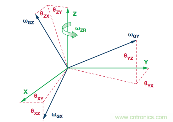 運動控制系統通常會建立慣性參考系,其中包含三個相互垂直90°的軸。這三個軸為MEMS IMU中的各個傳感器提供方位參考。理想情況下,陀螺儀的各個旋轉軸將與系統參考系中的軸完全對齊,將IMU安裝到平臺上之后,其將監視運行情況。這種情況下,在慣性參考系中圍繞其中一個軸旋轉,只有該軸的陀螺儀會生成響應。實際操作中,無法實現這種效果,因為機械缺陷必定會造成一些對齊誤差,從而導致離軸陀螺儀響應慣性參考系中圍繞一個軸的旋轉運動。量化此響應需要一些三角恒等式,并謹慎定義陀螺儀的對齊誤差。
