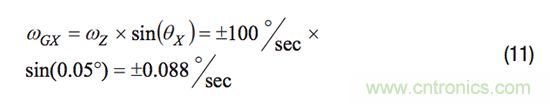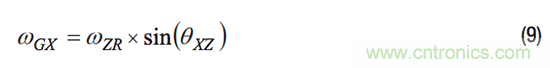 每個陀螺儀的對齊誤差均具有兩個分量,分別定義其相對于慣性參考系中另一個軸的對齊誤差。例如,對于圖2中的系統,θXZ代表x軸陀螺儀相對于z軸的對齊誤差。此對齊誤差定義有助于建立公式以計算離軸陀螺儀對系統慣性參考系中圍繞另一個軸旋轉運動的響應。公式9中給出了一個示例,其量化了x軸陀螺儀相對于z軸的對齊誤差(θXZ)和圍繞z軸旋轉(ωZR)而產生的響應(ωGX)。