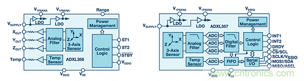 圖2. ADXL356和ADXL357功能框圖