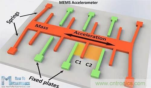 通用 MEMS 感應技術(shù)是使用片載可變電容器。在運動中,綠色的固定板保持靜止,而橙色的重物沿加速度軸彎曲。通過這種運動,電容值 C1 和 C2 會隨著固定板與重物之間距離的變化而變化。