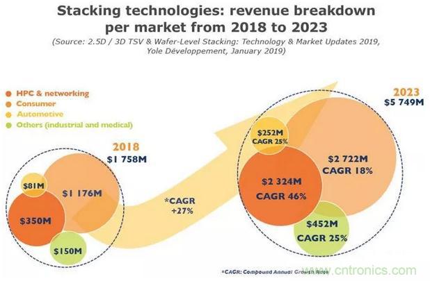 消費類市場(主要是CIS應用),是2018年堆疊封裝營收的最大貢獻者,占據了65%以上的市場份額。盡管如此,高性能計算(HPC)是推動3D封裝技術創新的主要應用,到2023年期間,該應用增長速度最快,市場份額預計將從2018年的20%增長到2023年的40%。