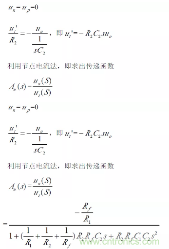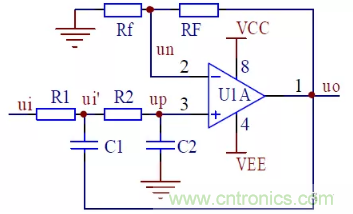 對于二階壓控低通濾波器來說,當通帶放大倍數Aup =1(單位增益)時,圖所示電路變為圖所示,其中RF=R1+R2。