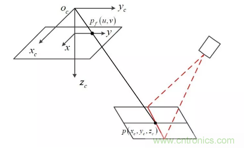 相機(jī)的成像模型簡化為小孔成像模型,則特征點(diǎn)的圖像坐標(biāo)Pf 與其在攝像機(jī)坐標(biāo)系下的三維坐標(biāo)P 之間的關(guān)系可表示為: