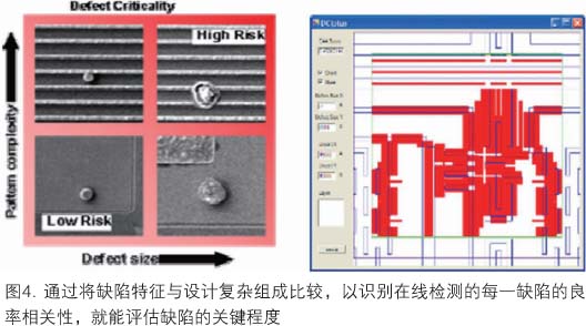 為了提高監(jiān)測和識(shí)別關(guān)鍵缺陷的效率,必須采用新方法。依賴簡單的缺陷過濾和基于大小的缺陷次序是不夠的。為了取得最佳的檢測和鑒評預(yù)算,必須對檢測設(shè)置與鑒評策略二者使用新的知識(shí)信息。從設(shè)計(jì)和模擬得到的關(guān)鍵區(qū)域和熱點(diǎn)這樣一些知識(shí)信息可以插入檢測方略中,優(yōu)化可用的檢測容量。在完成檢測過程中和完成后,基于多重檢測結(jié)果的缺陷過濾和分類使用戶能快速識(shí)別新缺陷,有效地量化已知的缺陷類型。利用設(shè)計(jì)空間中缺陷鄰近位置的信息(此處,設(shè)計(jì)的復(fù)雜組成是了解的),可以較好地評估每一缺陷的良率相關(guān)性,提供缺陷的排序(圖4)。