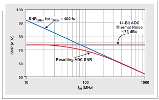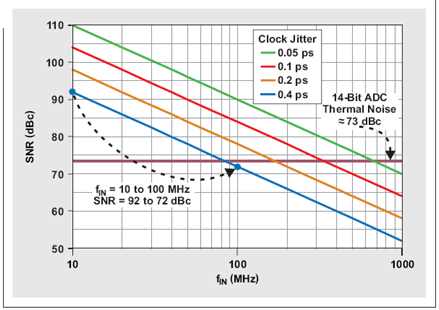 讓我們來對一個具有 400 fs 抖動時鐘電路和 ~73 dB 熱噪聲的 14 位 ADC 進行分析。低輸入頻率(例如:10MHz 等)下,該 ADC 的 SNR 主要由其熱噪聲定義。由于輸入頻率增加,400-fs 時鐘抖動越來越占據主導,直到 ~300 MHz 時完全接管。盡管相比 10MHz 的 SNR,100MHz 輸入頻率下時鐘抖動帶來的 SNR 每十倍頻降低 20dB,但是總 SNR 僅降低 ~3.5 dB(降至 69.5dB),因為存在 73-dB 熱噪聲(請參見圖 5):